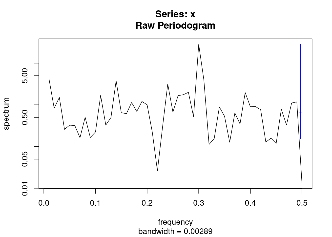 A função spectrum realiza a estimativa da densidade espectral de uma série temporal. O estimador do espectro (periodograma) é definido como “estimado” pois ele faz uma estimativa e não uma média de todos os dados gerados.