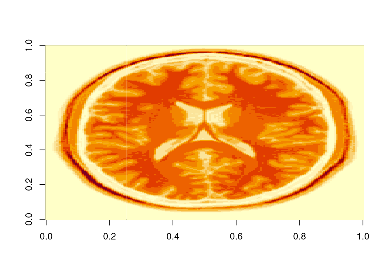image(volume[,,90,1], col = gray((1:50)/50))